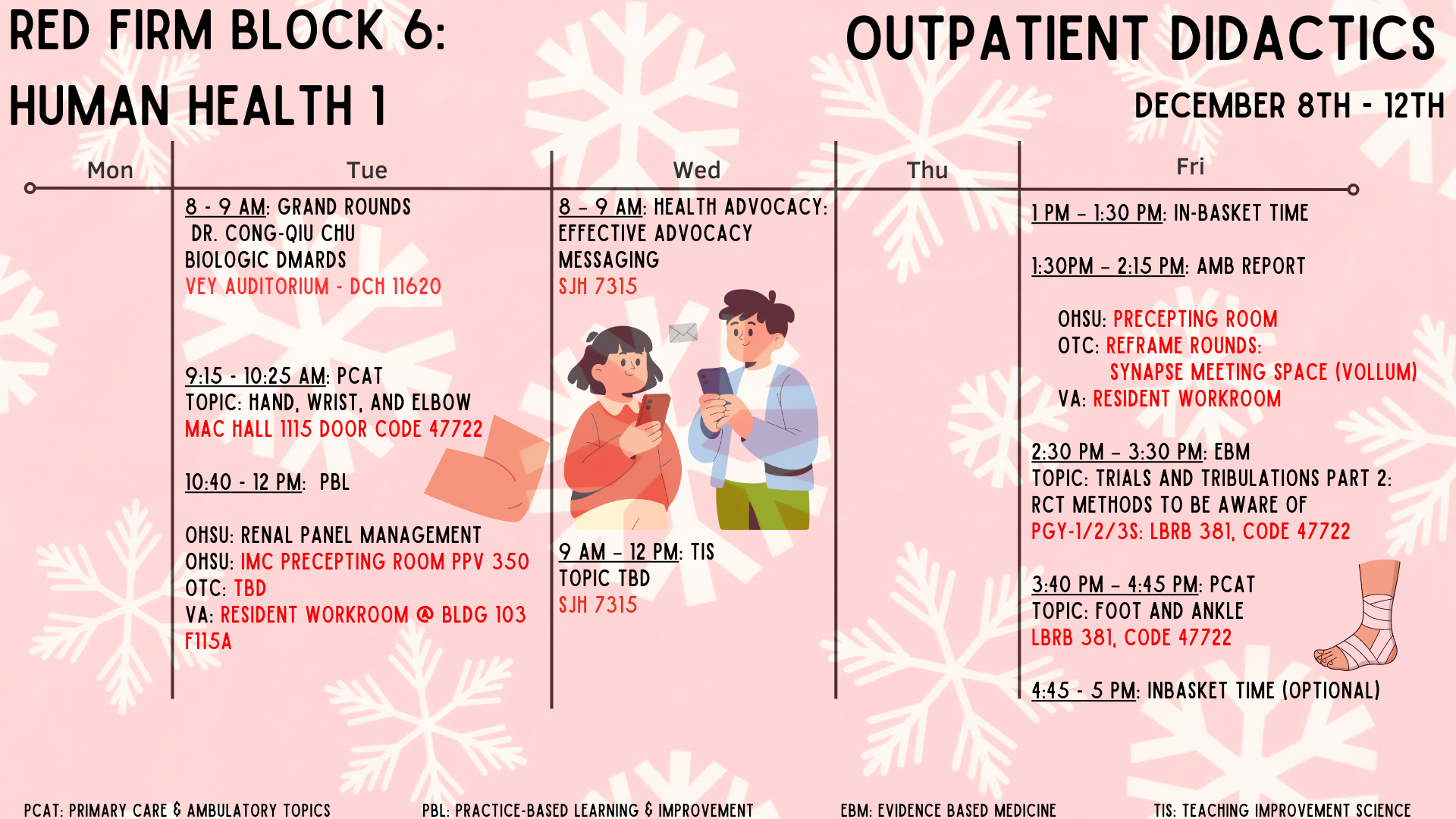 This site is independently maintained by the OHSU Internal Medicine Chief Residents and the faculty members who oversee individual rotations. In addition to the latest education schedule (and locations!) below, you can find links to curricular, clinical, policy, and rotation-specific resources in the above tabs. Please email the chiefs with questions or content requests, and with any photos for this site or social media!