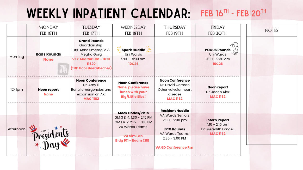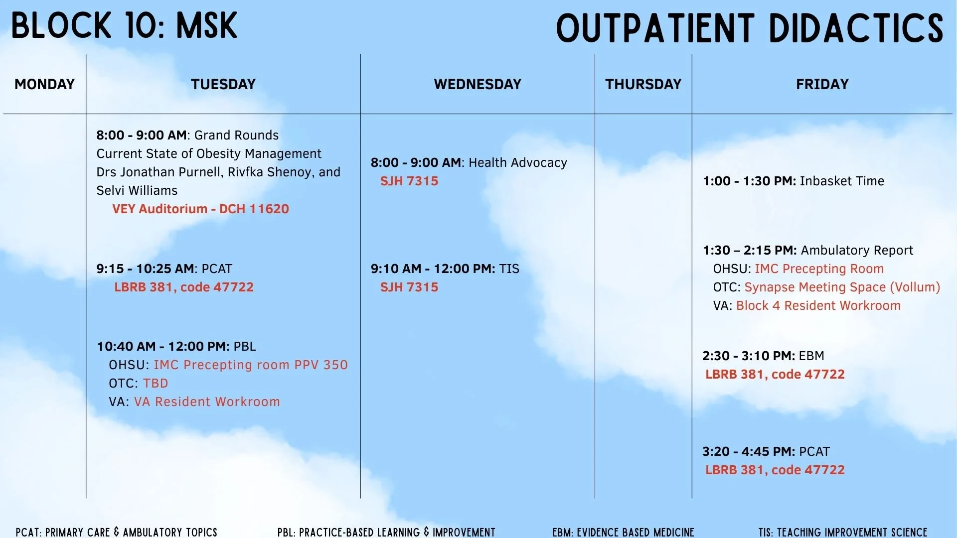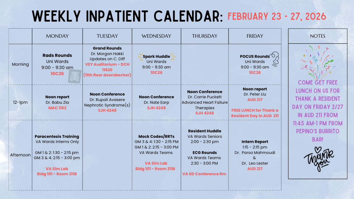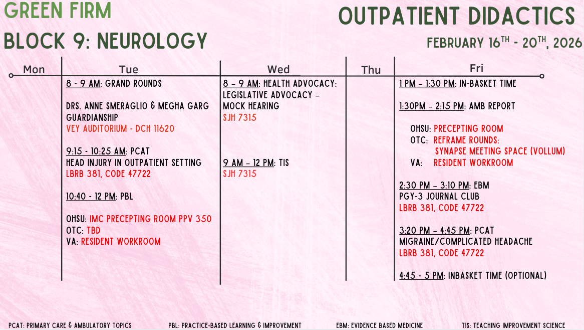 This site is independently maintained by the OHSU Internal Medicine Chief Residents and the faculty members who oversee individual rotations. In addition to the latest education schedule (and locations!) below, you can find links to curricular, clinical, policy, and rotation-specific resources in the above tabs. Please email the chiefs with questions or content requests, and with any photos for this site or social media!