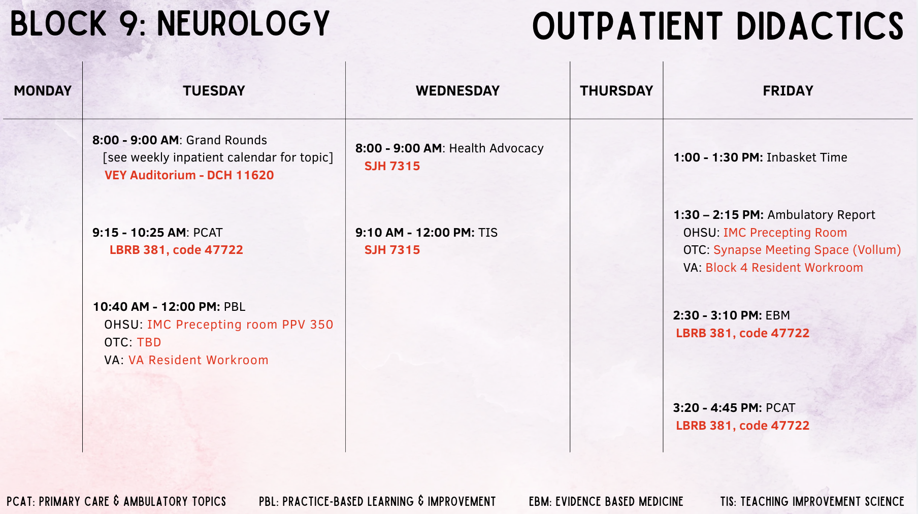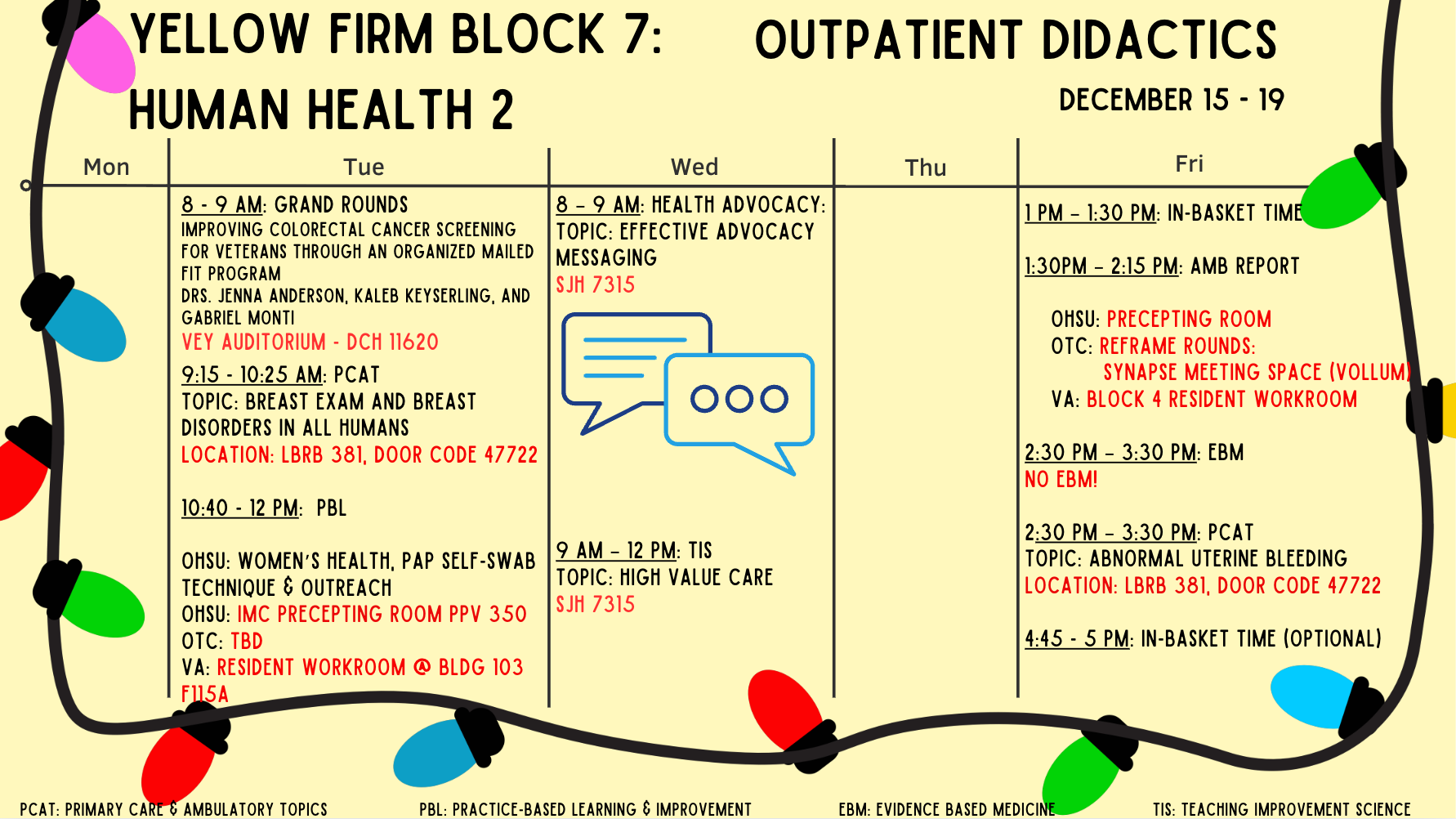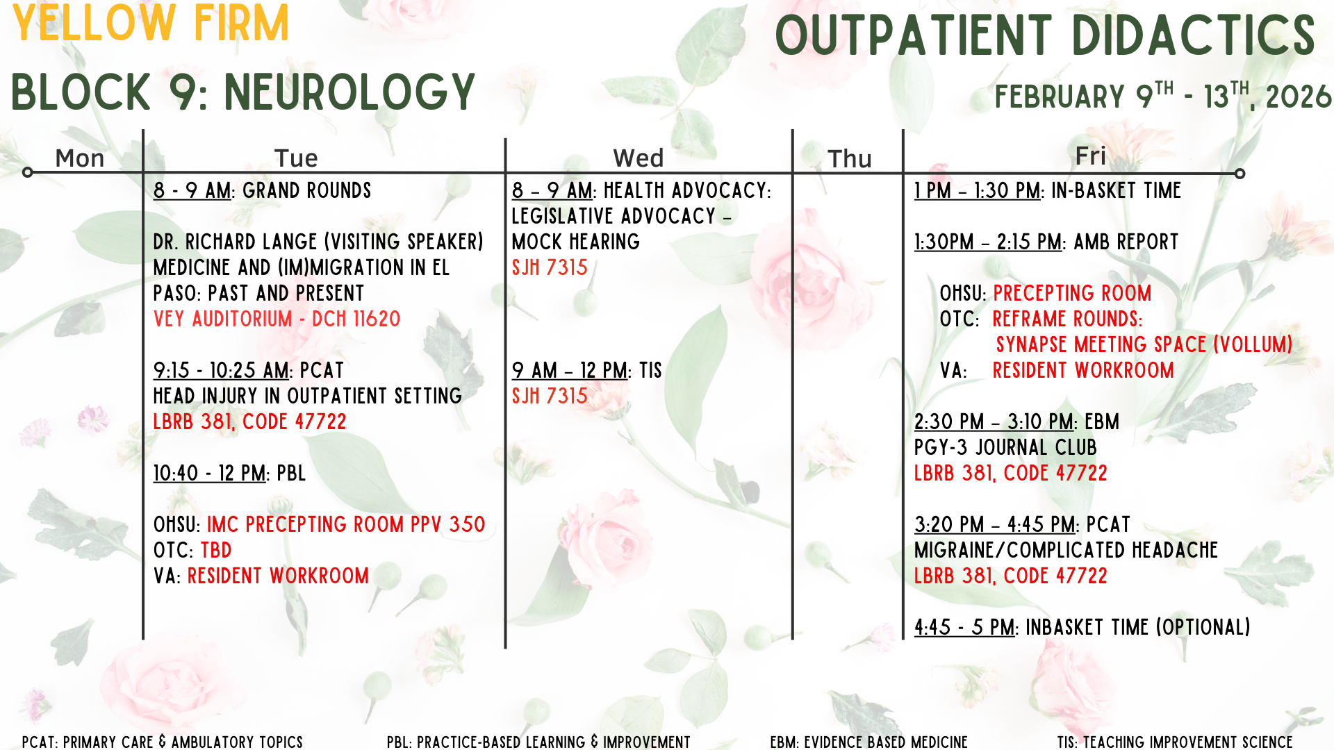 This site is independently maintained by the OHSU Internal Medicine Chief Residents and the faculty members who oversee individual rotations. In addition to the latest education schedule (and locations!) below, you can find links to curricular, clinical, policy, and rotation-specific resources in the above tabs. Please email the chiefs with questions or content requests, and with any photos for this site or social media!